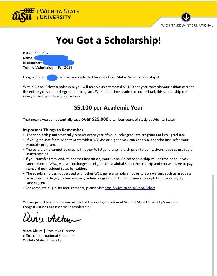 Em H. sẽ theo học chương trình chính cử nhân kỹ thuật hàng không là ngành em yêu thích và đang theo học tại đại học Bách Khoa TP. HCM. Với lực học tốt và tiêng anh Ielts 6.5, Du học Tân Tiến rất vui đã giúp em xin được học bổng trị giá 25,000$ cho chương trình đại học tại Wichita State University. Với mức học phí chỉ tầm gần 17,000$/ năm, và sau khi được trừ học bổng em chỉ cần đóng tầm 12,000$/ năm tương đương học phí cao đẳng, ngoài ra trường cung cấp hơn 200 chuyên ngành khác nhau và thế mạnh là kỹ thuật hàng không.