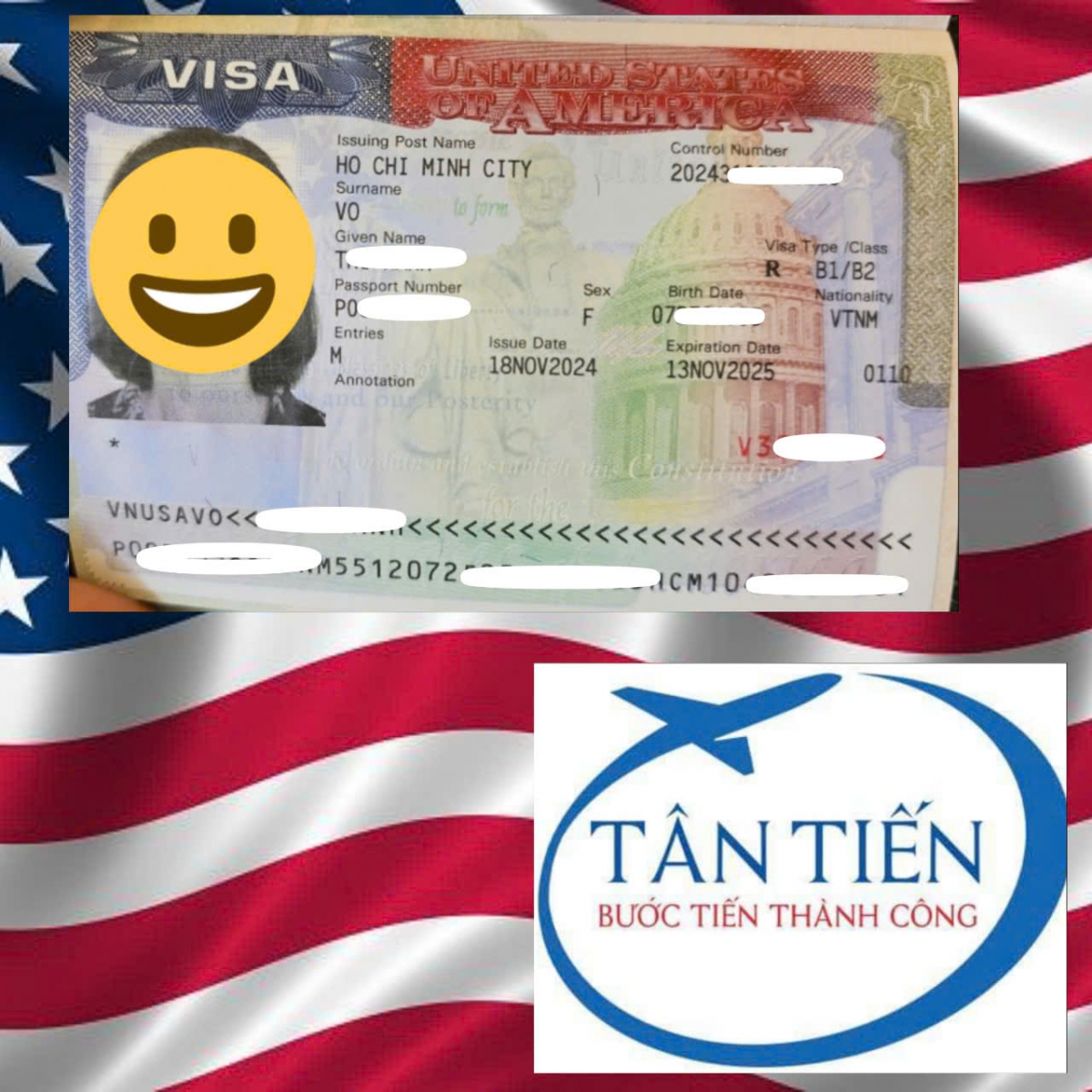Du học Tân Tiến chúc mừng cô Hạnh đã nhận được visa du lịch Mỹ. Chúc cô có một chuyến đi vui vẻ với nhiều trải nghiệm tuyệt vời tại Hoa Kỳ.